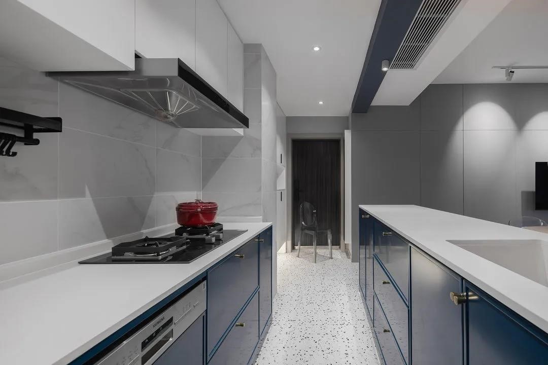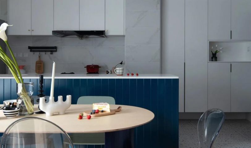 將廚房打開,與入戶客餐廳連為一體,符合現在年輕人居住需求與審美喜好的LDK布局方式,讓空間獲得放大功能。藍白搭配的廚房配以精致的銅把手,空間時尚而精致。煙機與洗碗機均采用內嵌的方式,廚房整體顯得更加統一簡潔。