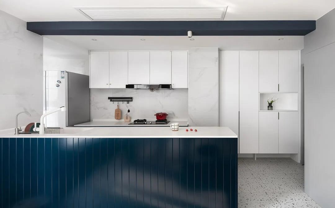 原始廚房與餐廳之間有一根40cm的梁,為了盡量保證層高,廚房區域吊頂均采用30cm高度,一是為了包平廚房與入戶之間的梁,二是為了風管機位置的安放。裸露出來的梁刷深藍色,反而跟櫥柜之間有了呼應,增添了空間的趣味構成感