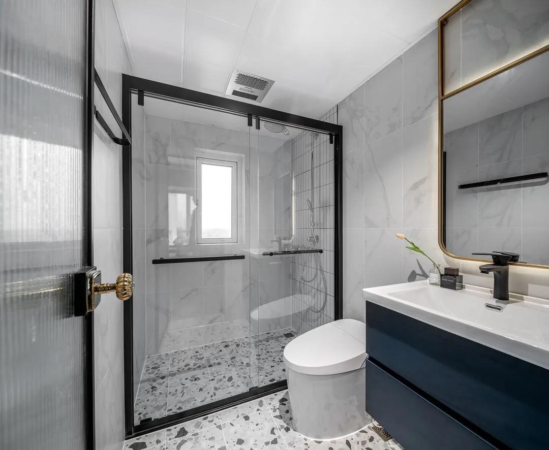 硬裝設計上選擇了白灰色系,干凈、簡潔,讓緊湊的衛生間看起來相對開闊。配以深藍的浴室柜,延續整個空間的藍色基調,再點綴金色邊框帶燈帶的浴室鏡,讓衛浴空間也變得更加精致