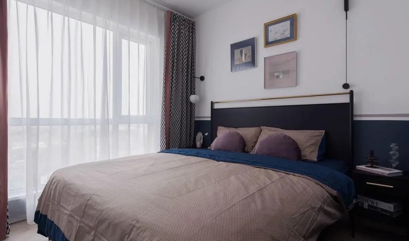 墻面同樣延續了藍白主基調,藍色半墻點綴粉灰邊帶,讓空間層高視覺上得到拉伸。窗簾搭配上,選擇了深藍與白相間的幾何紋,同時岔了臟粉的邊帶,與空間呼應,不僅如此,在床品選擇以及掛畫搭配上,都豐富空間層次的同時,又做到和諧統一