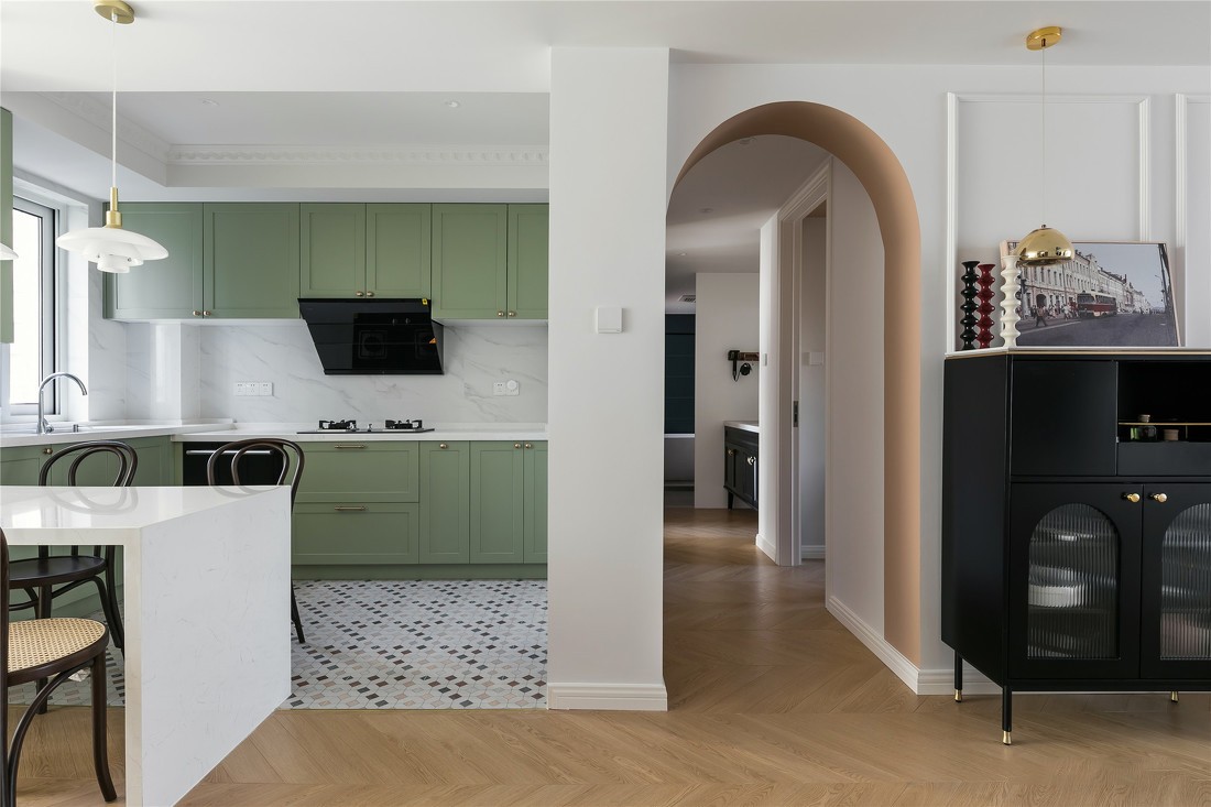 在材質、色彩、形狀的不斷變化中,廚房與水吧臺之間形成了一種互動式的藝術。各種體塊的藝術穿插,創造了更多隱形的收納空間,輕盈、通透、干凈、有序的感覺撲面而來