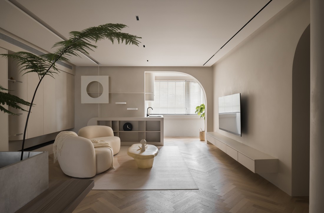 空間整體以素雅安靜的低飽和色為主,選擇奶油色系,讓空間在清簡寧靜的同時,也有家的溫馨和溫度。客廳的布局也遵循自然簡約的原則,平面吊頂、無主燈設計、同色系的軟裝,讓空間視覺趨于一體,更為融洽,與陽臺之間的門洞采用弧形線條勾畫,結(jié)合空間的奶油色調(diào),更加溫柔流暢
