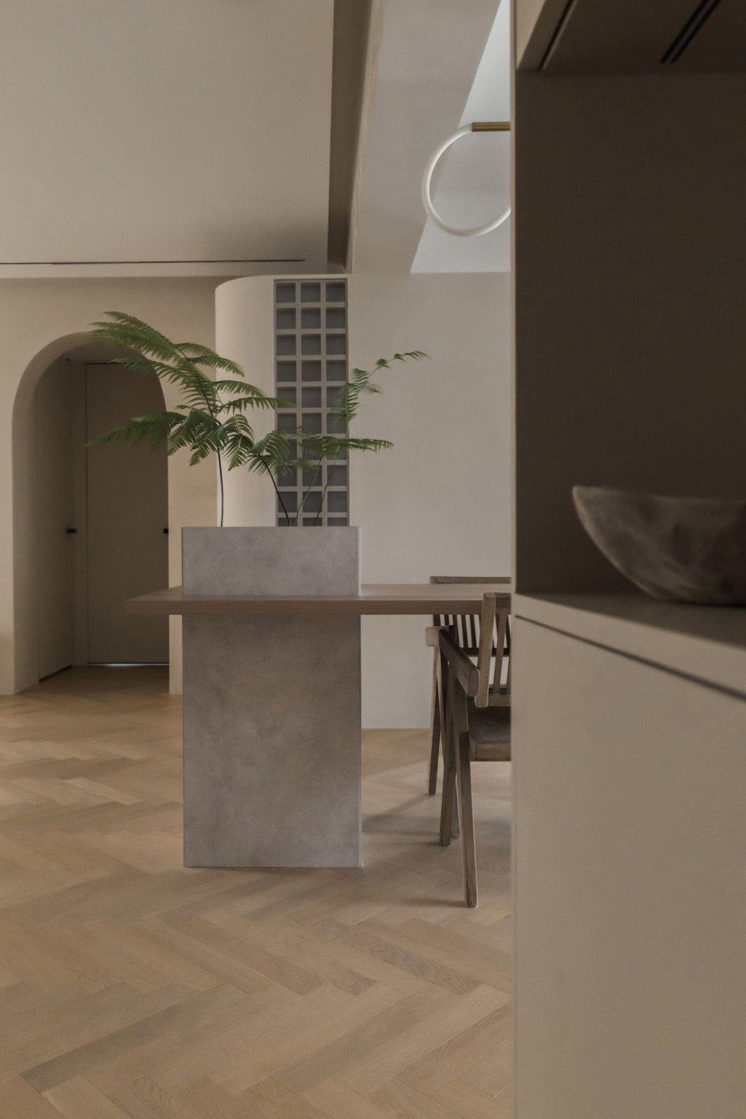 若以原戶型梁體劃分空間,客廳過大而餐廳過小,直接將餐挺區(qū)域外擴又會因為梁體而顯得不夠和諧,于是我們將背景墻做設計,以梁體為界,左側(cè)打造玻璃格子墻,同時以曲面過渡銜接,富有層次感的設計弱化了梁體的視覺效果,而餐桌+石臺的設計,也自然而然過渡了餐廳的空間,視覺感更為流暢舒適