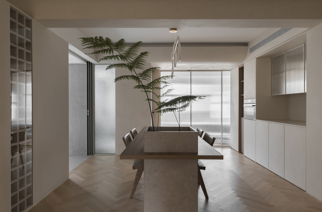 餐桌+石臺居中擺放,對餐廳也形成洄游動線,餐廳-廚房-洗手間-次臥之間的動線彼此連通,更為便利。廚房與洗手間銜接的墻體選擇用壓花玻璃作為隔斷,視覺效果更為通透,同時也讓洗手間內(nèi)的采光更好。