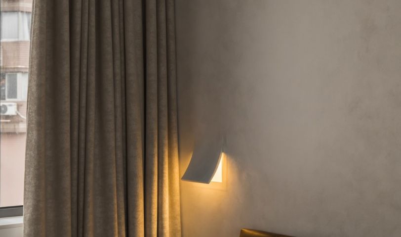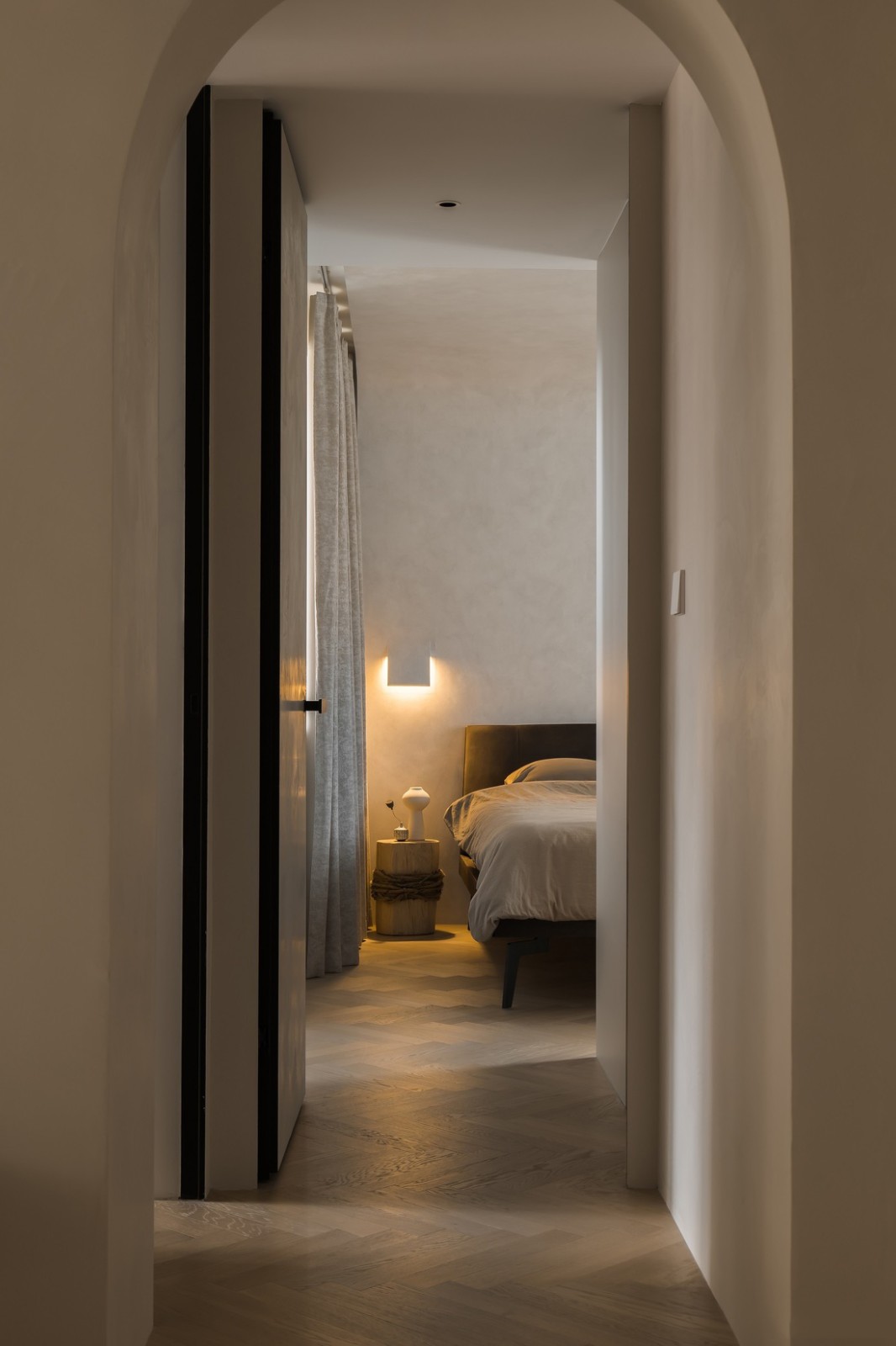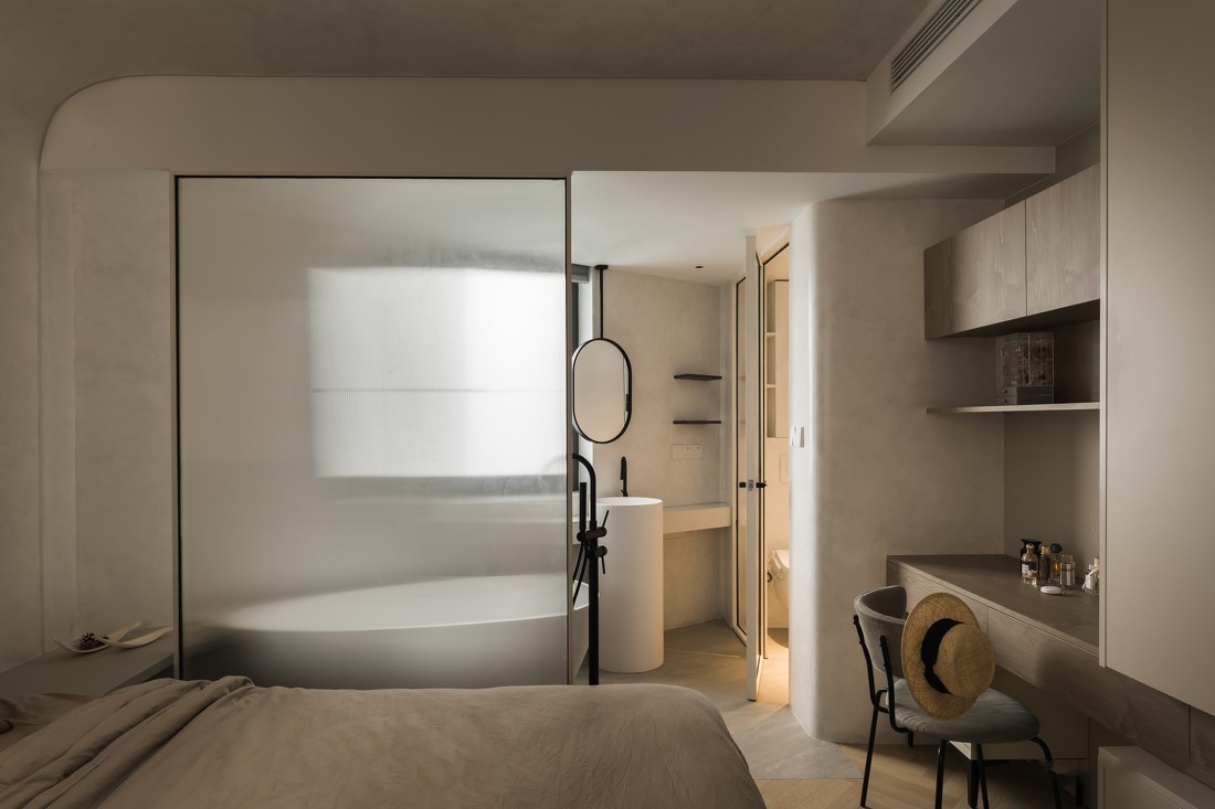 臥室的背景墻與頂面用弧面過渡,形成一體,墻面與吊頂都采用微水泥材料,視覺上形成鐵一體,增加視覺延伸感,微水泥的獨特紋理與質(zhì)感也讓臥室更具有自然、質(zhì)樸的氣息
