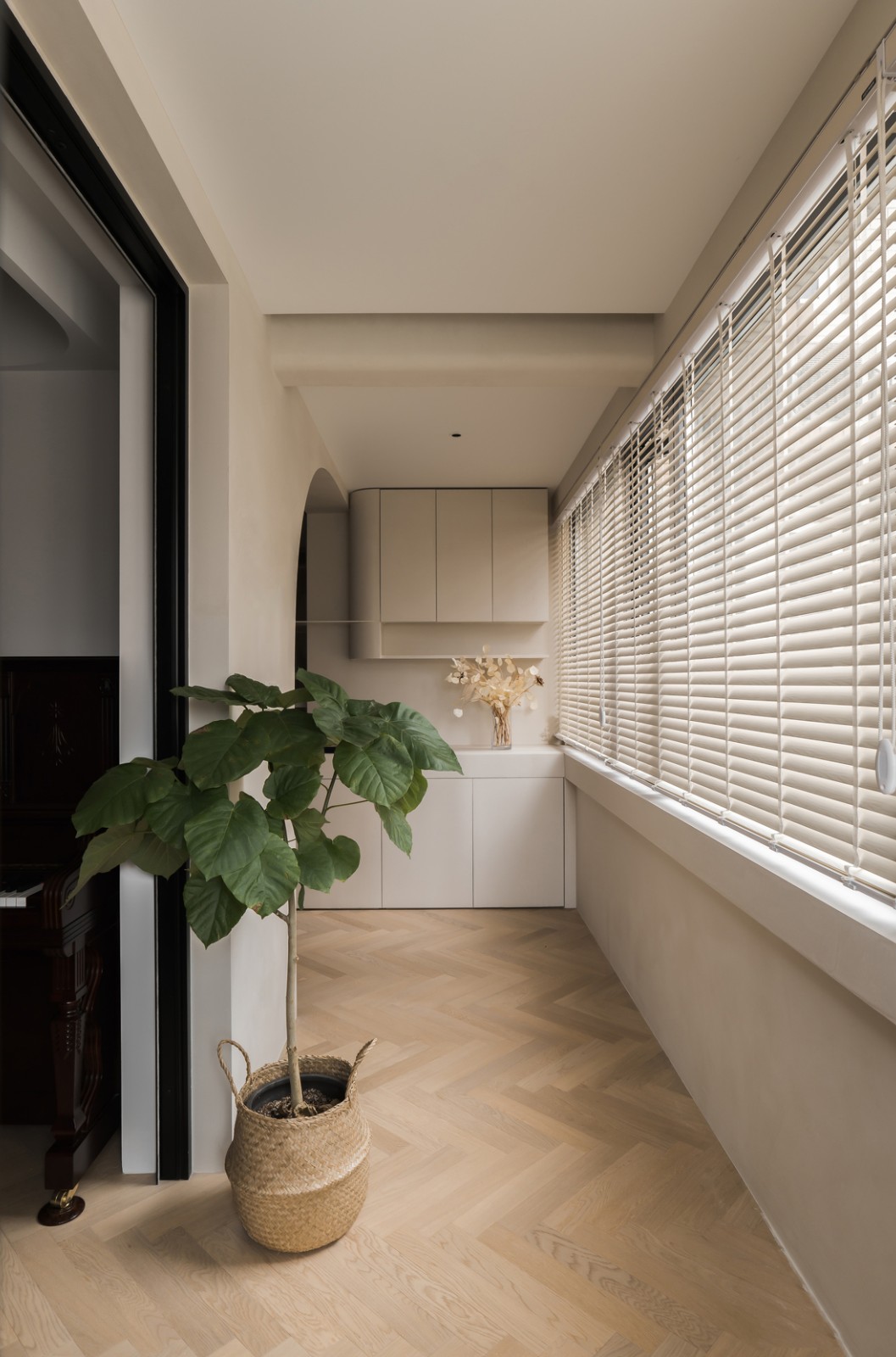 陽臺一直連接上書房,與書房之間安裝一扇玻璃折疊門,開放與隔斷輕松自如。家里的公共空間動線被完整的連接起來,回字形動線讓自由感更為強烈。一株屋主親自搬回來的綠植,裝在藤編籃筐里,文藝氣息與自然氣質(zhì)交織,為家裝點生動的綠意
