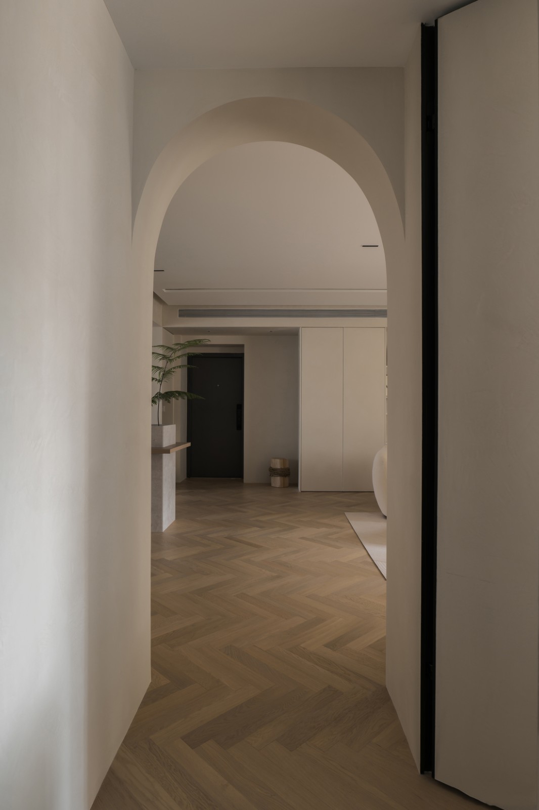 從走廊看向主臥,左側(cè)為書房,全屋地板通鋪無門檻石,也無踢腳線,視覺上更加整潔干凈,門體開到頂端,更顯開闊大氣,門體材質(zhì)與墻壁選擇同樣的微水泥,隱形門的設計讓家的氣質(zhì)更顯簡約