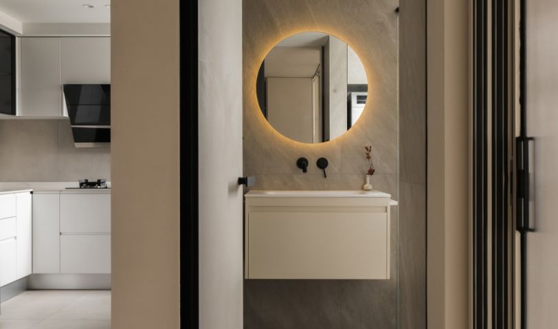 洗手間的布局經(jīng)過精心考量,將干區(qū)設置在正對門體的方位,即使不管上門也比較美觀,懸空式浴室柜、一體式臺盆、入墻式水龍頭和圓形浴室鏡,看上去簡潔大方,顏值和實用性兼有