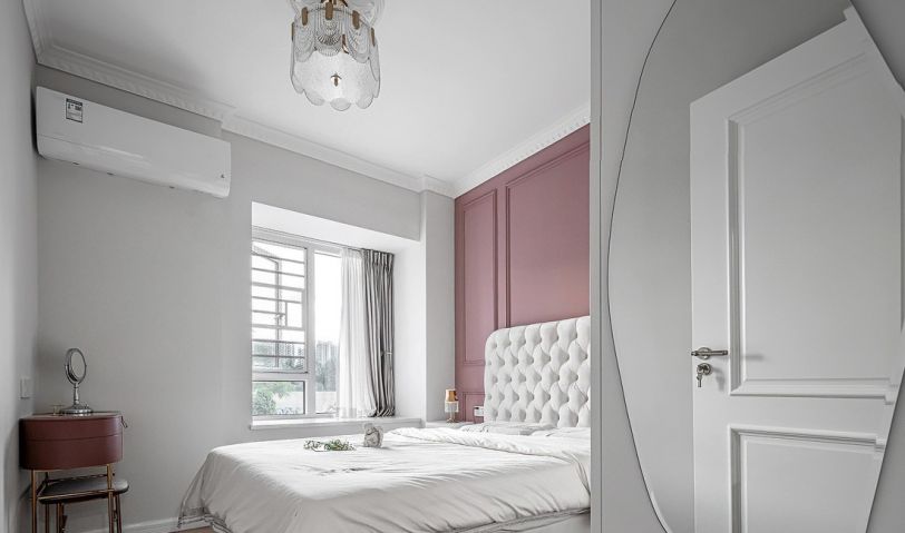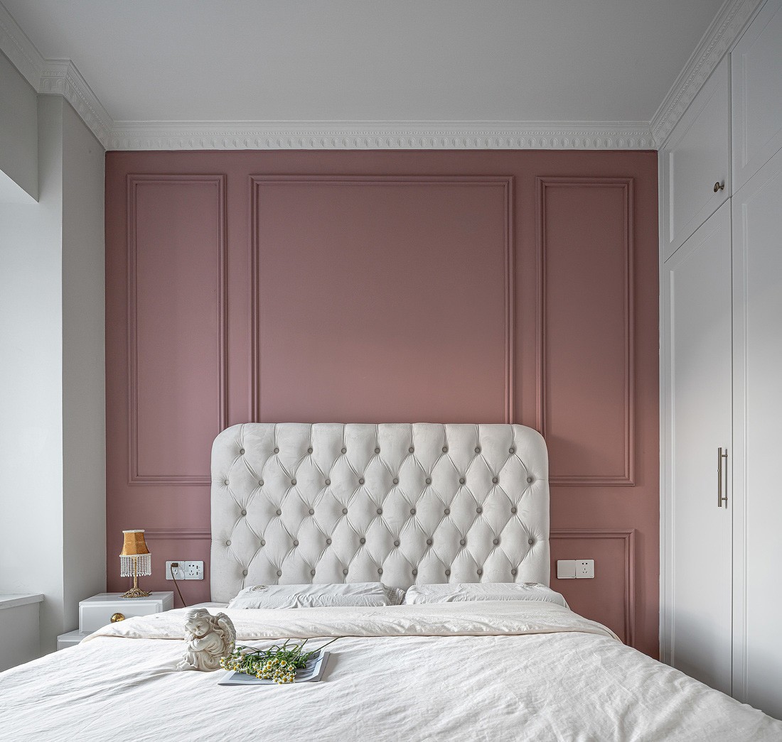 主臥的床頭背景墻采用了粉紅色的墻漆,自然、清新的色調散發出幸福的味道,營造溫情與浪漫的氛圍。飄窗也不失為一個愜意之地,慵懶地靠在抱枕上,品茶賞景,豈不快哉1