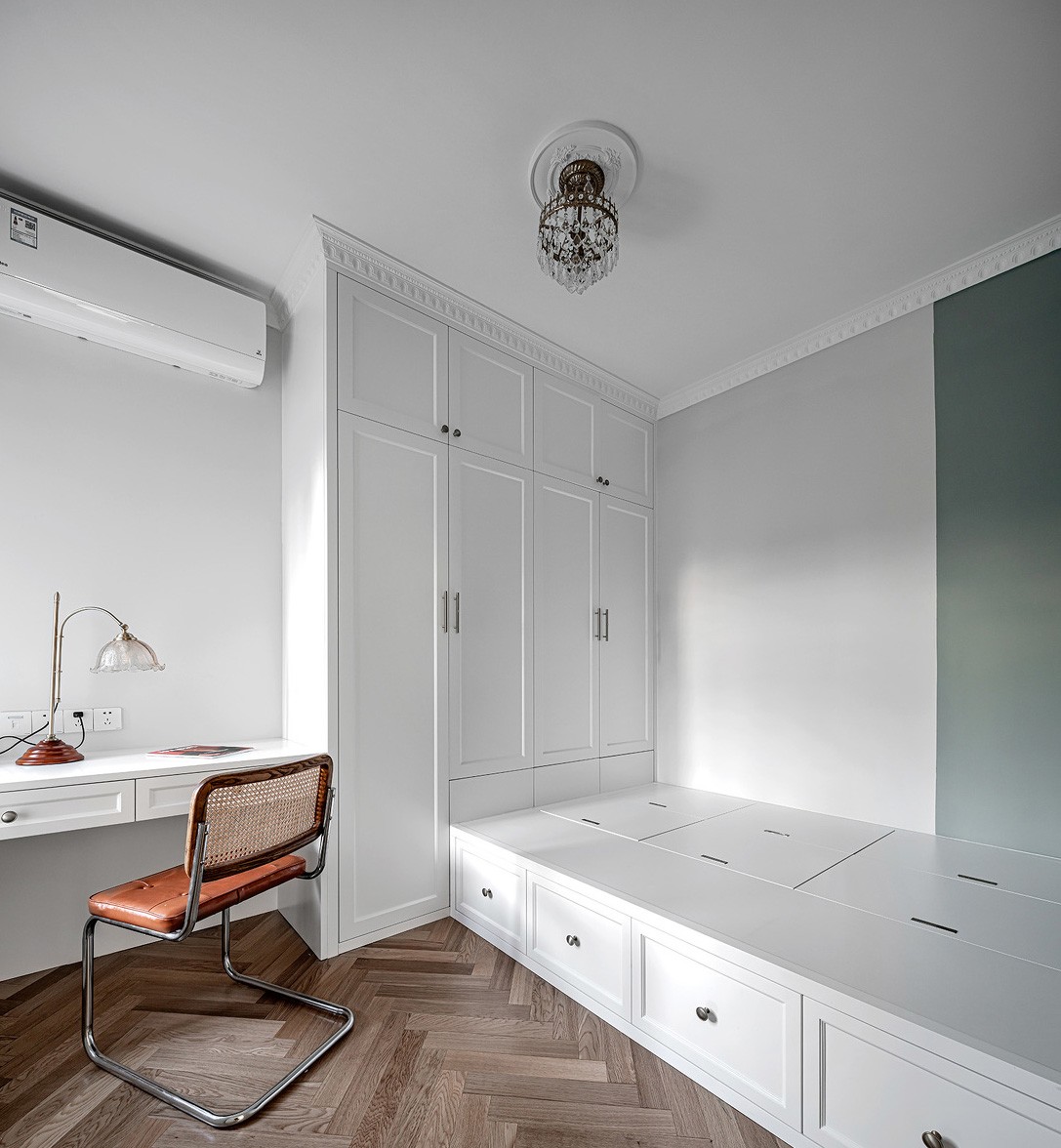 客臥除了方便平日業主父母的偶爾留宿,做個榻榻米用作是收納,不浪費每一處空間。為了凸顯空間的簡潔,收納柜門采用嵌入式和將柜體的存在感降到最低,提升空間的整體感和美觀度,放眼望去,簡潔統一