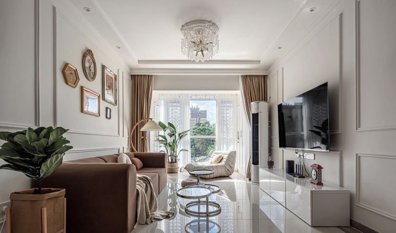 客廳仍然是沿用白色的基調,沙發背景墻和電視背景墻的采用了PU線條裝飾,在沙發背景墻中放置了精致復古的裝飾畫,使整個墻面看起來不至于太單調,與電視背景墻相呼應,搭配了簡約的白色電視柜和富有設計感的小茶幾,顯得精致而優雅1