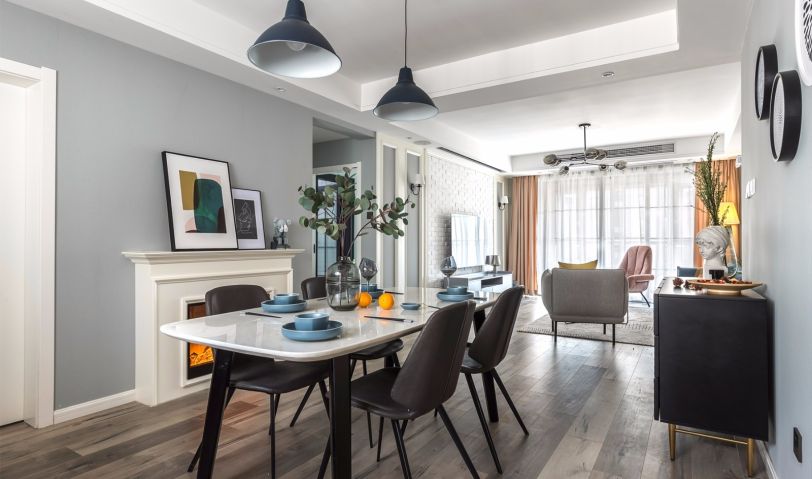 在客廳的設(shè)計(jì)上,設(shè)計(jì)師以內(nèi)斂的灰色調(diào)打底,塑造出一個(gè)靜謐安定的空間氛圍。透過對(duì)軟裝家居材質(zhì)的混搭,及初冬壁爐中的火焰緩緩的升起讓給生活帶來更多的儀式,使整個(gè)空間精致而不張揚(yáng),沉謐簡寧的氛圍