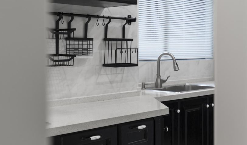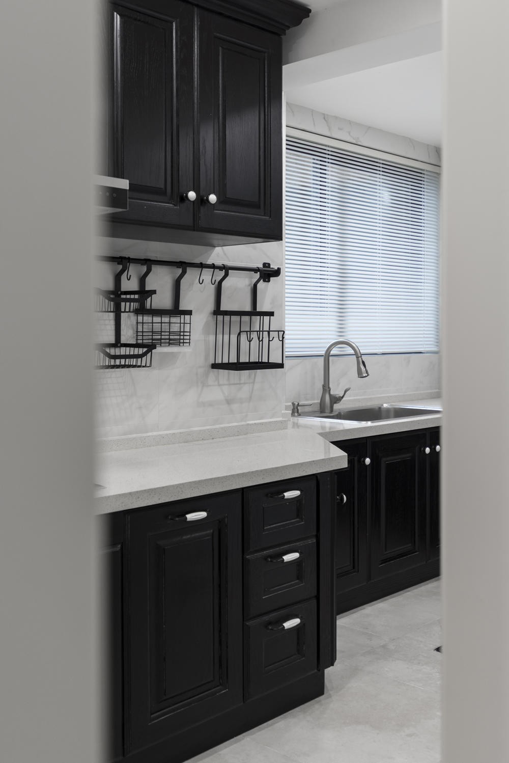 廚房鑒于戶型的限制,所以在本案的話,是只做了簡單的一面地柜來滿足后期的使用需求。沒有做雙邊桂,是考慮到后面的一個站立空間。柜體顏色采用了儒雅黑來進行搭配,經典耐看,不失潮流。