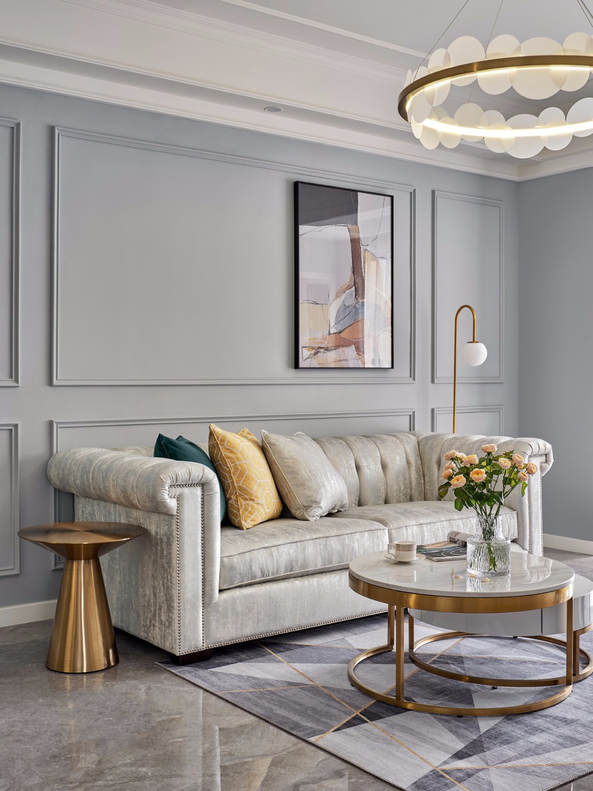 選用淺色系作為客廳的主色調,融合金屬達到輕奢感。整體配色給人清新明亮的感覺,少許深色運用不顯壓抑反而更為吸睛。