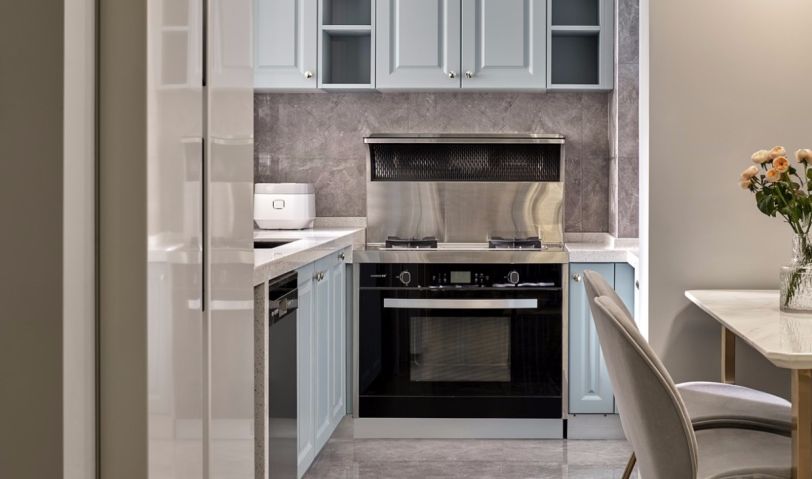 L型廚房操作臺面節約空間,大理石花紋地磚配上墻面線條造型讓空間更具層次,同時拉伸視覺效果。金屬燈具、餐椅的加入,讓空間更顯質感。