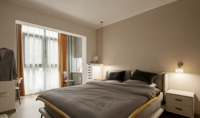 靜謐的臥室,以光以色彩調和空間情感,橙色為點睛之筆,將暖的主題延伸到家里的每一處。一面藕粉色床頭背景墻,與空間的灰白色,營造出層次感。精心挑選的一白一橙床頭柜,突破了常規搭配,讓空間更出彩。