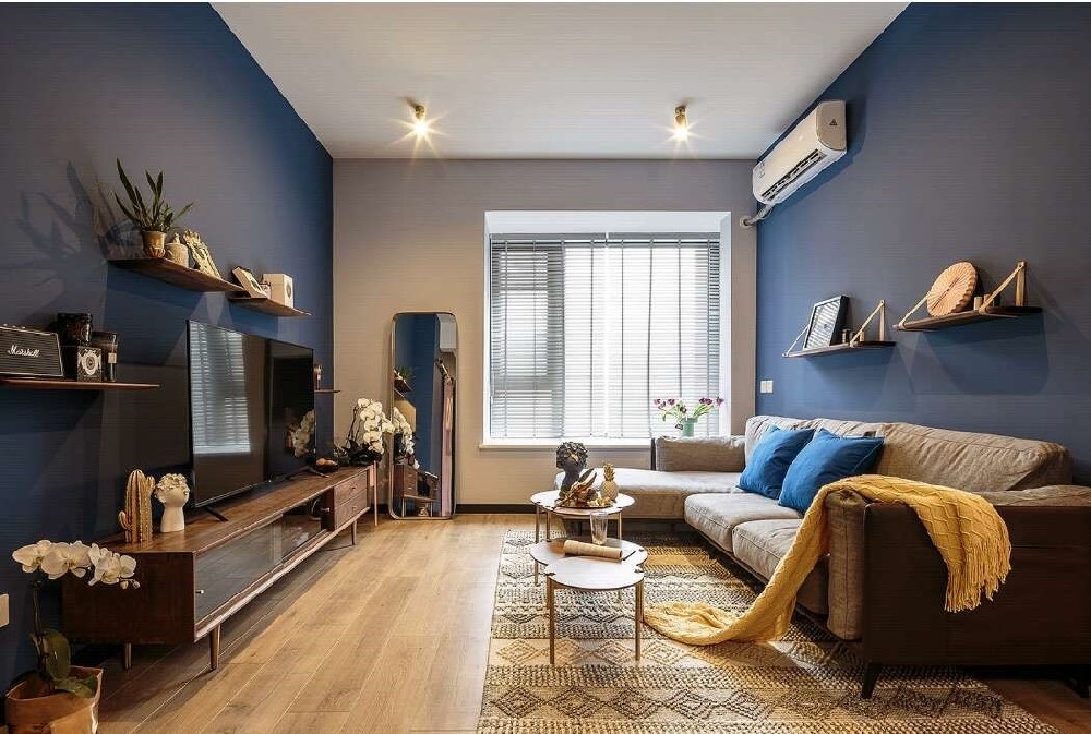 藍色的墻面乳膠漆配上金色的燈具顯得復古有質感