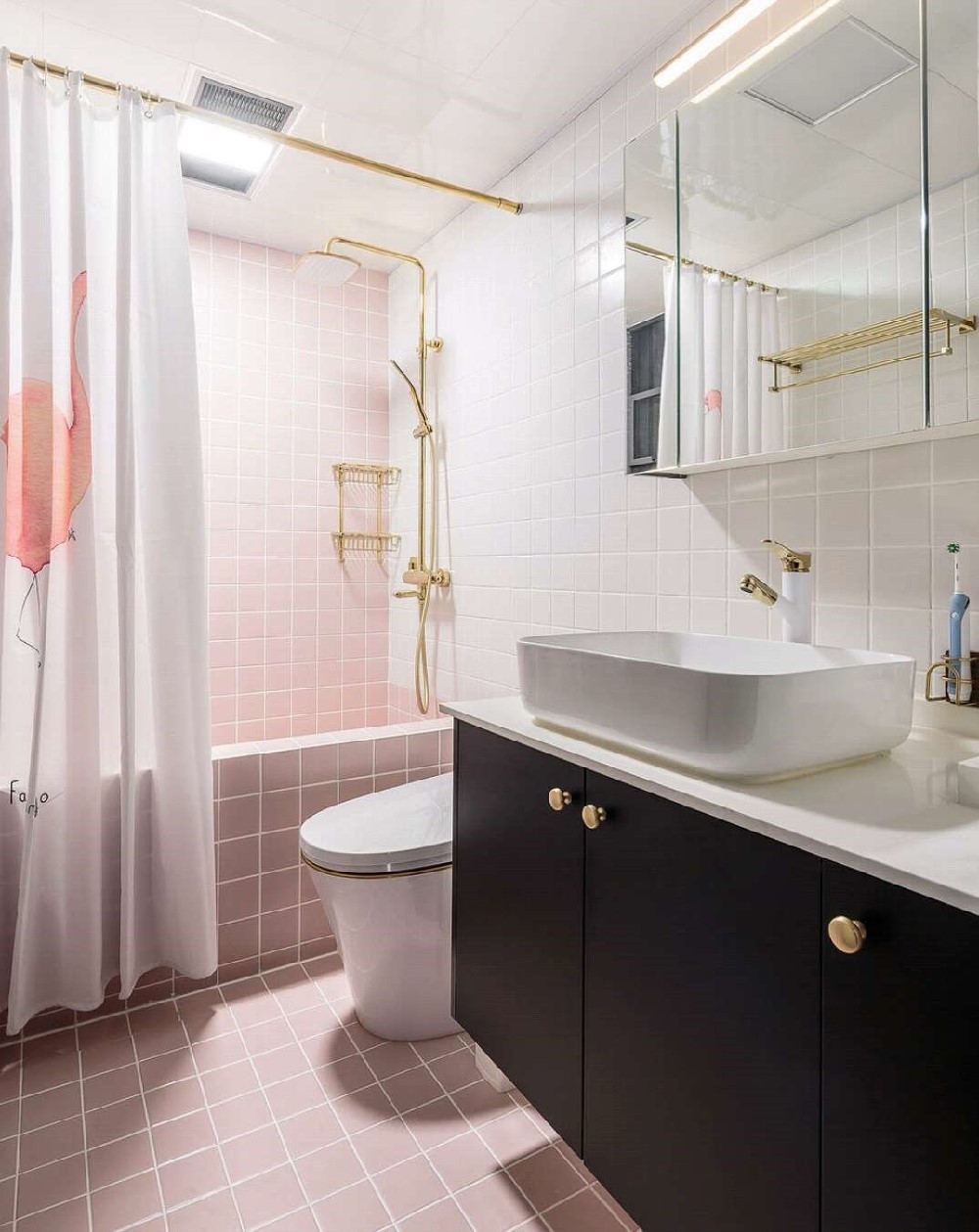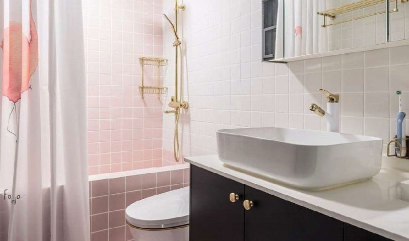 粉色的墻磚搭配粉色的浴簾