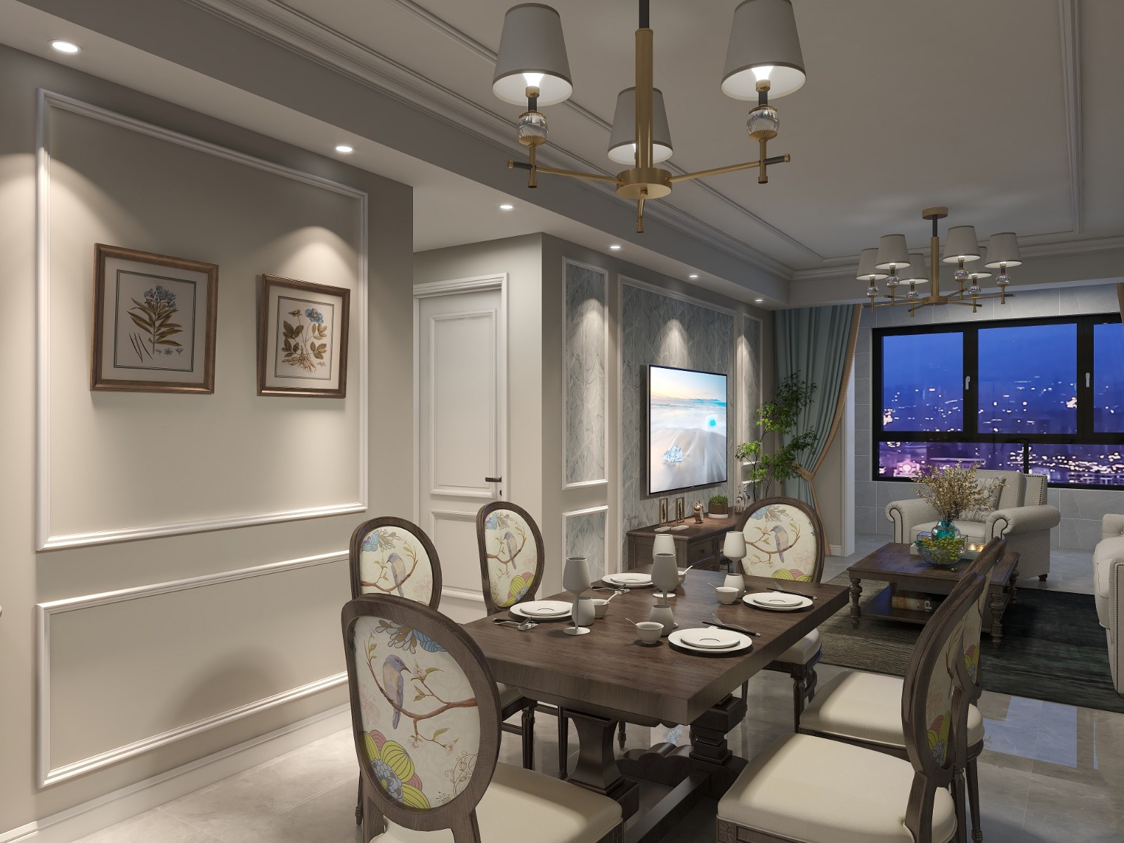 小美式風格,與傳統美式風格不同,沒有大面積深色帶來的沉悶感,一般都是以淺色為主,深色為輔助,客餐廳整體都流露出優雅溫馨的感覺,顏色上明朗清澈。