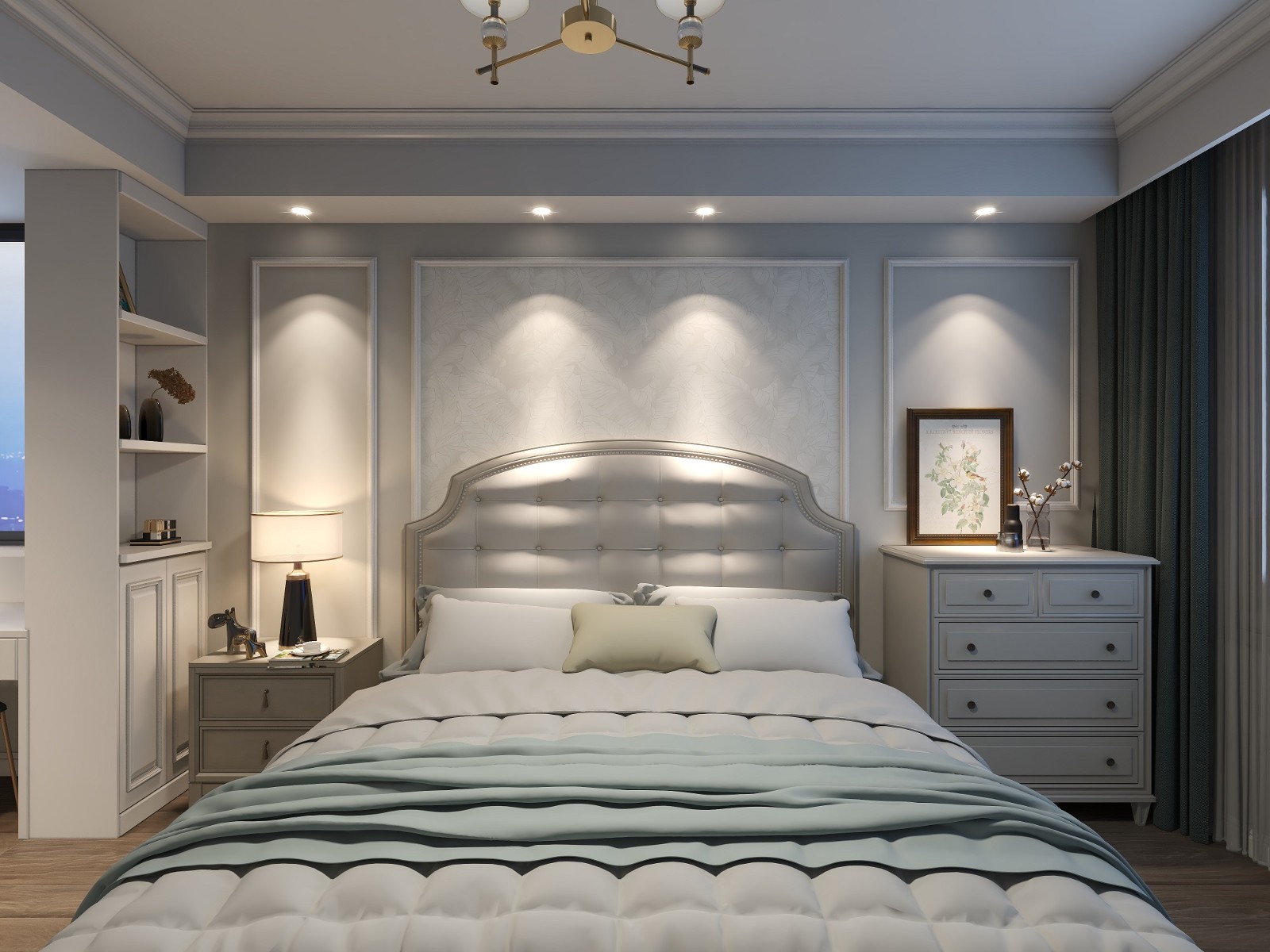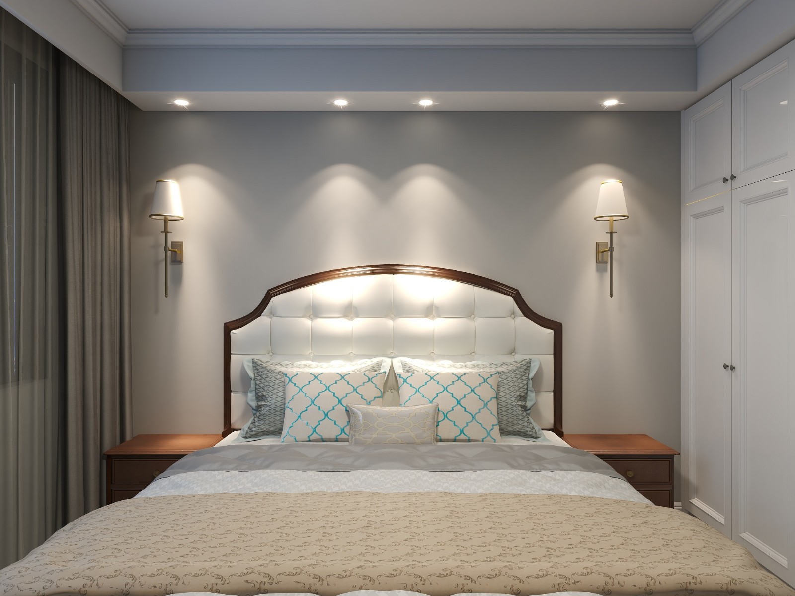 次臥以簡約實用為主,高靠背的軟包床,兩側美式的壁燈,在細節處呼應著整體的小美風