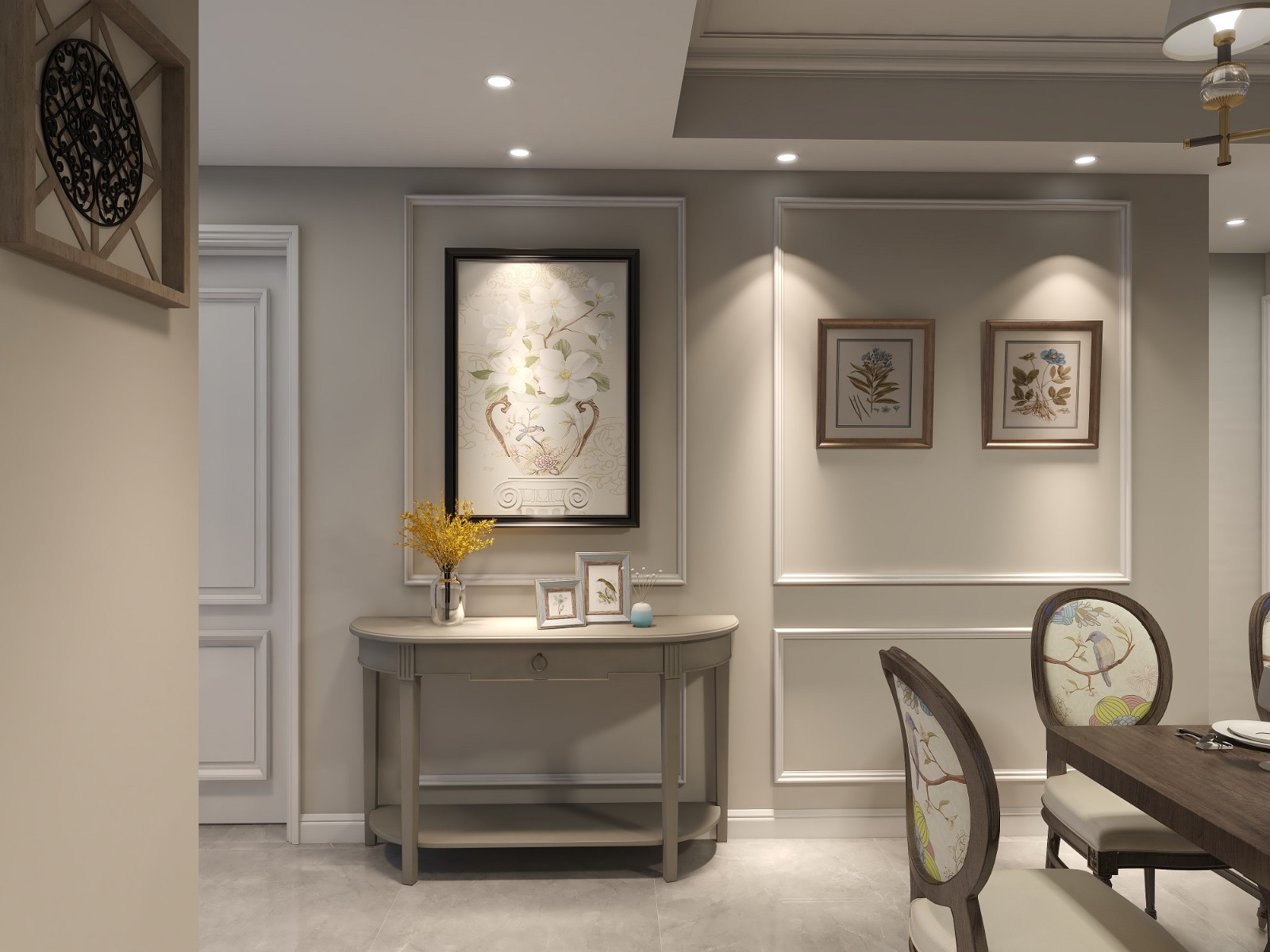過道的端景,是客人對這個家印象的開始,美式的玄關柜和簡約的藝術畫,既能突出自己的個性,又不張揚是主人對這個家的完美表達