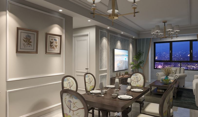 客廳淺色系乳膠漆墻面,搭配淺灰色布藝沙發,提升客廳的舒適感,電視背景墻則用美式經典的石膏線裝飾,精致耐看