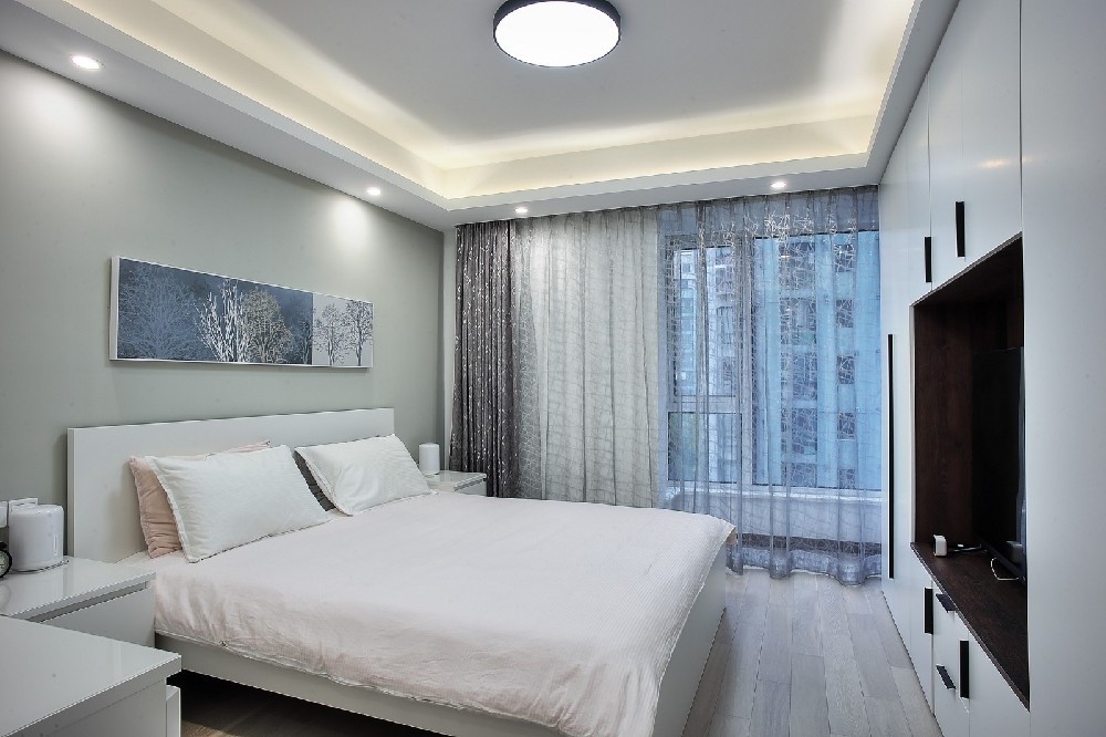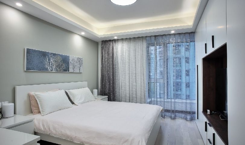 主臥長寬是3.9*3.4較為方正的空間,常規設計床與柜子兩邊容易顯得擁擠,設計時把柜子放在電視背景墻。