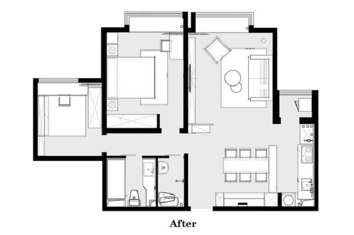 考慮到原始戶型餐廚空間無窗,客廳與餐廚空間做開放式設計,將光引入餐廳,既解決了餐廚區(qū)采光問題,還為家人互動留下充裕空間。
