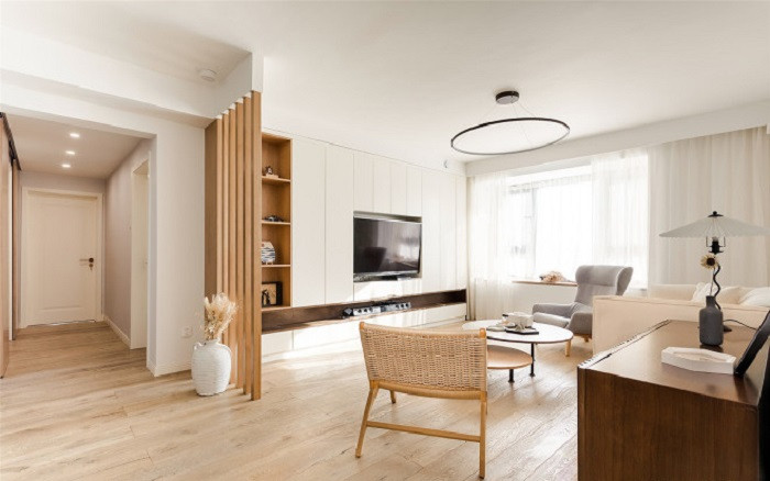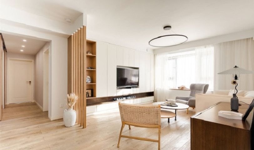 設計中運用了較多木質元素,木地板、木立柱、原木餐椅......利用材質的特性,奠定空間溫暖基調。又通過色調和飽和度的變化,賦予居室變幻之感。