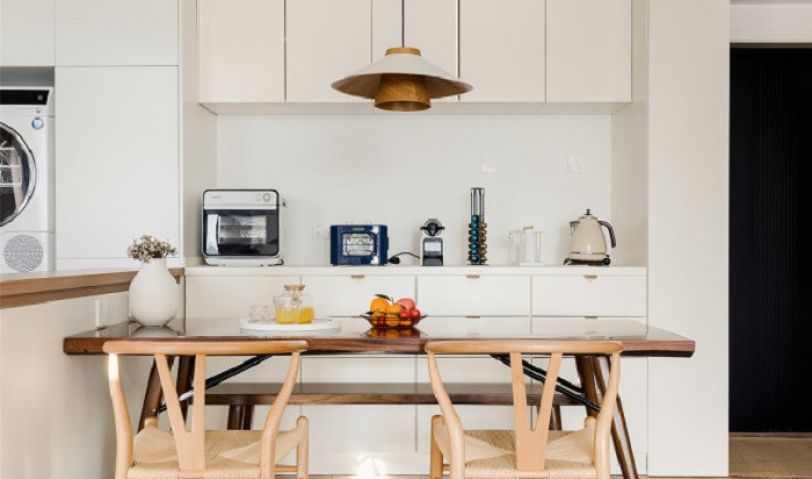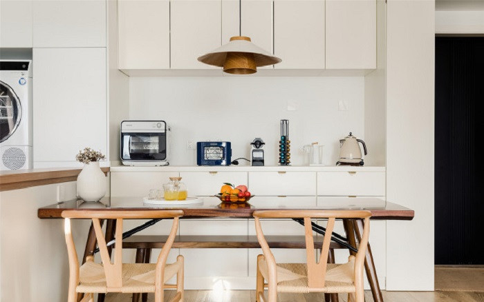 靠墻的一組定制柜可做餐邊柜,放上咖啡機,和烤箱,幾分鐘就能做出美味下午茶。柜子選擇用奶油色,增添空間溫柔氣質的同時,也調和黑色餐桌桌面的帶來的冰冷感。