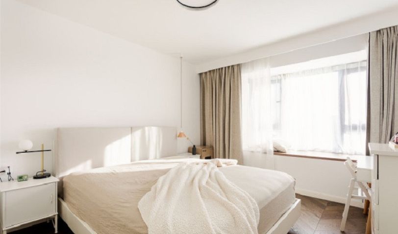 主臥延續(xù)簡約風格,墻頂一體,空間更加朗闊。靠墻打造整墻儲物柜,屋主不再為臥室收納煩惱。柜門按壓式的設計,避免擾亂空間視覺,柜子和墻更加融合。寬闊飄窗鋪上原木材質,陽光溫暖的午后,在飄窗處或臥或坐,靜享生活的靜謐悠閑。