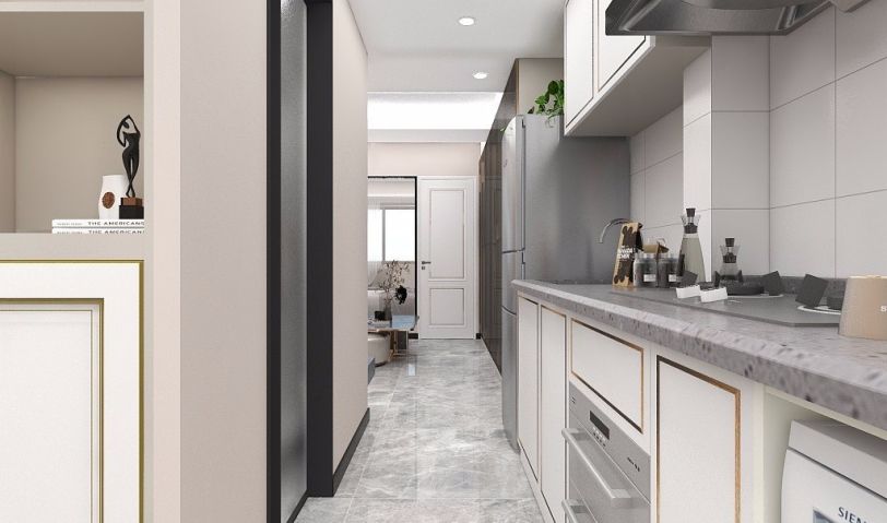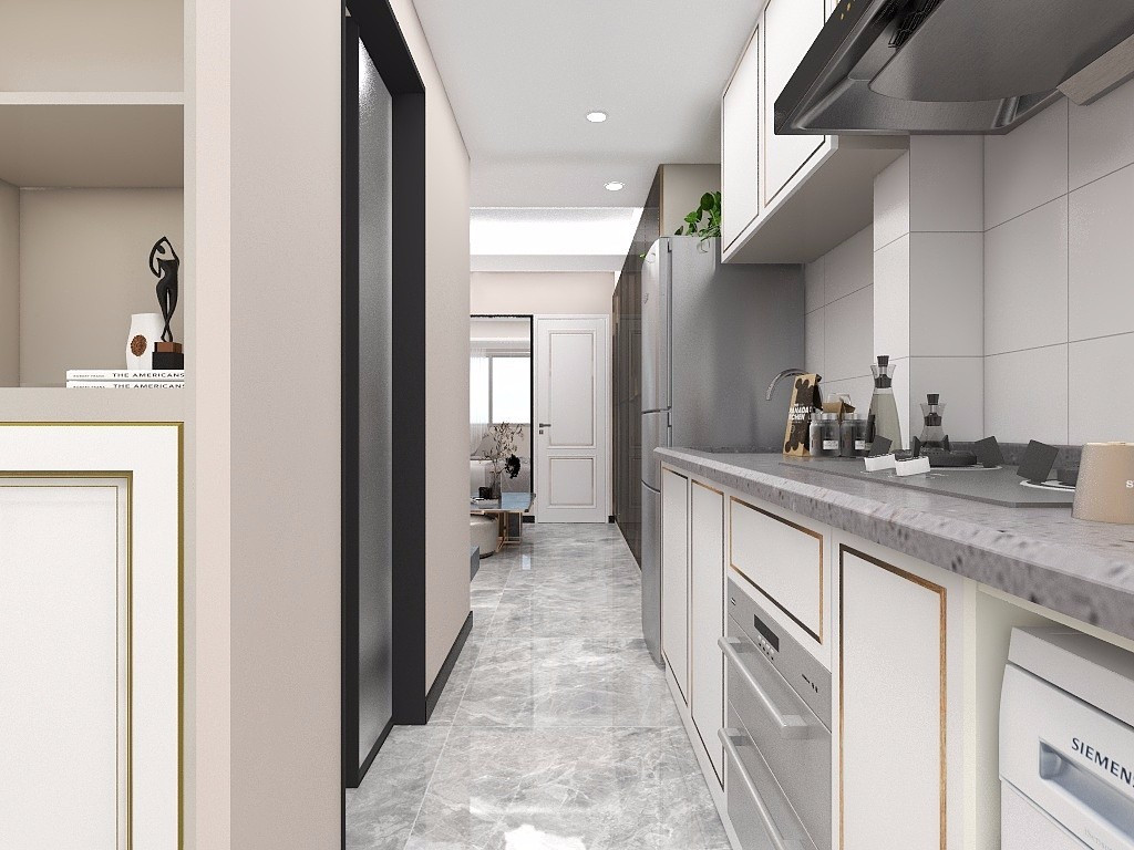 做了一字型開放式廚房,因為業(yè)主不常做飯,所以沒有復雜的設計,滿足正常需求就可以了