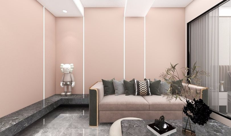 業(yè)主為單身女性,粉色與黑灰色的撞色完美契合業(yè)主的喜好,客廳與臥室之間采用了挖空采用玻璃設計,完美解決客廳光線問題