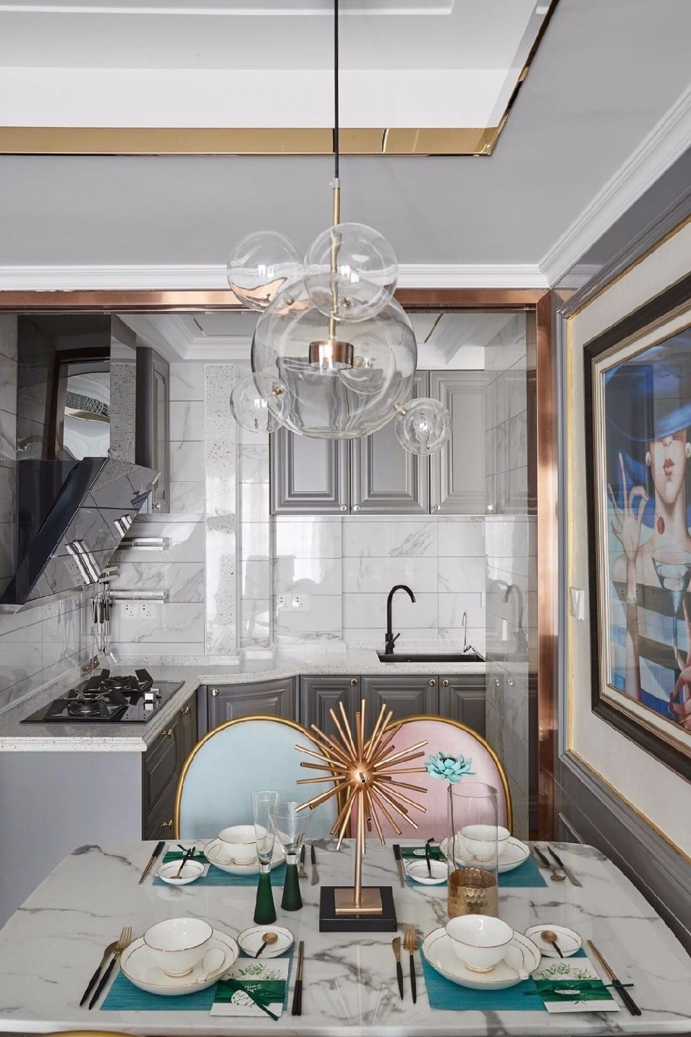 沙發采用簡單的皮質沙發,采用了調色的沙發單椅,色調很閑的華麗。客餐廳墻面結合簡單的護墻板和金屬線條結合,顯得輕奢感更足。