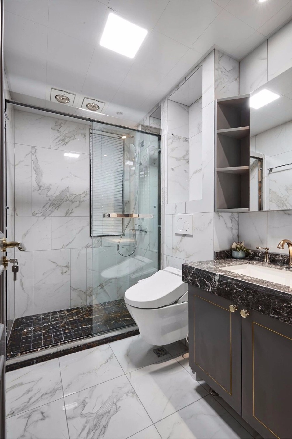 衛生間結合簡單的白色墻磚地磚,用黑色的柜子結合,空間顯得大氣而不壓抑。