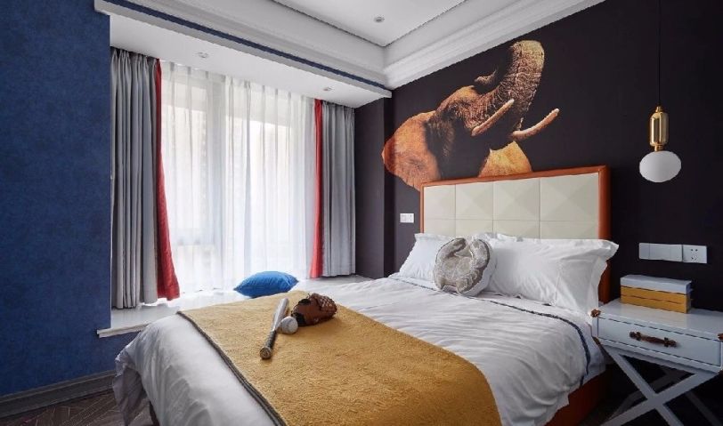 臥室床頭背景用黑色的布畫,整個色調也顯得很穩重。