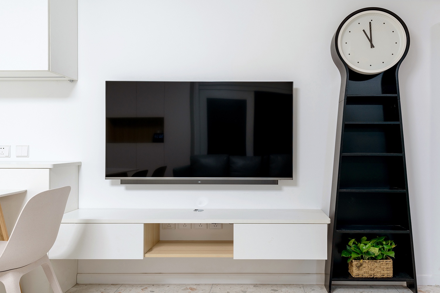 客廳由于是間接采光,整體以白色為主,地磚采用了大塊花紋的水磨石,用來活躍空間。