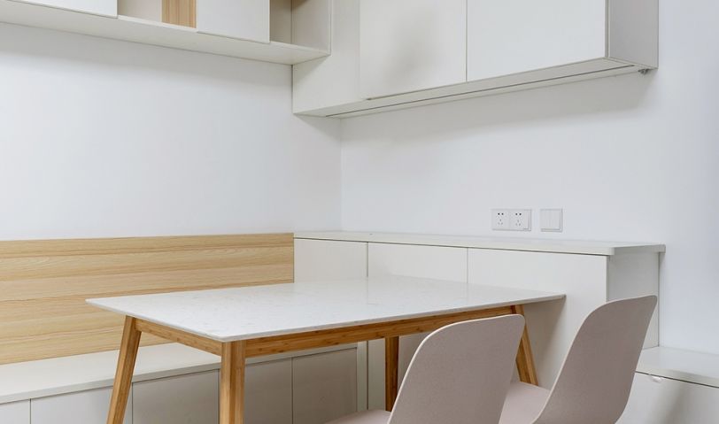 就餐區(qū)是餐桌結(jié)合卡座的形式,既能滿足一家的用餐需求,又能增加儲物。餐邊柜的設(shè)計可以將所有的茶具,以及水杯都可以收納起來,讓空間變得干凈整潔。