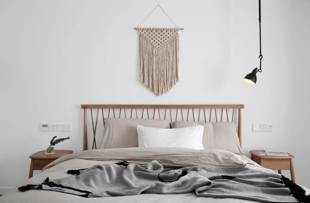 主臥室用原木色的床搭配暖灰色的床品,大白墻上掛著流蘇掛飾,整個主臥顯得素雅干凈,營造一個舒適的休憩氛圍。