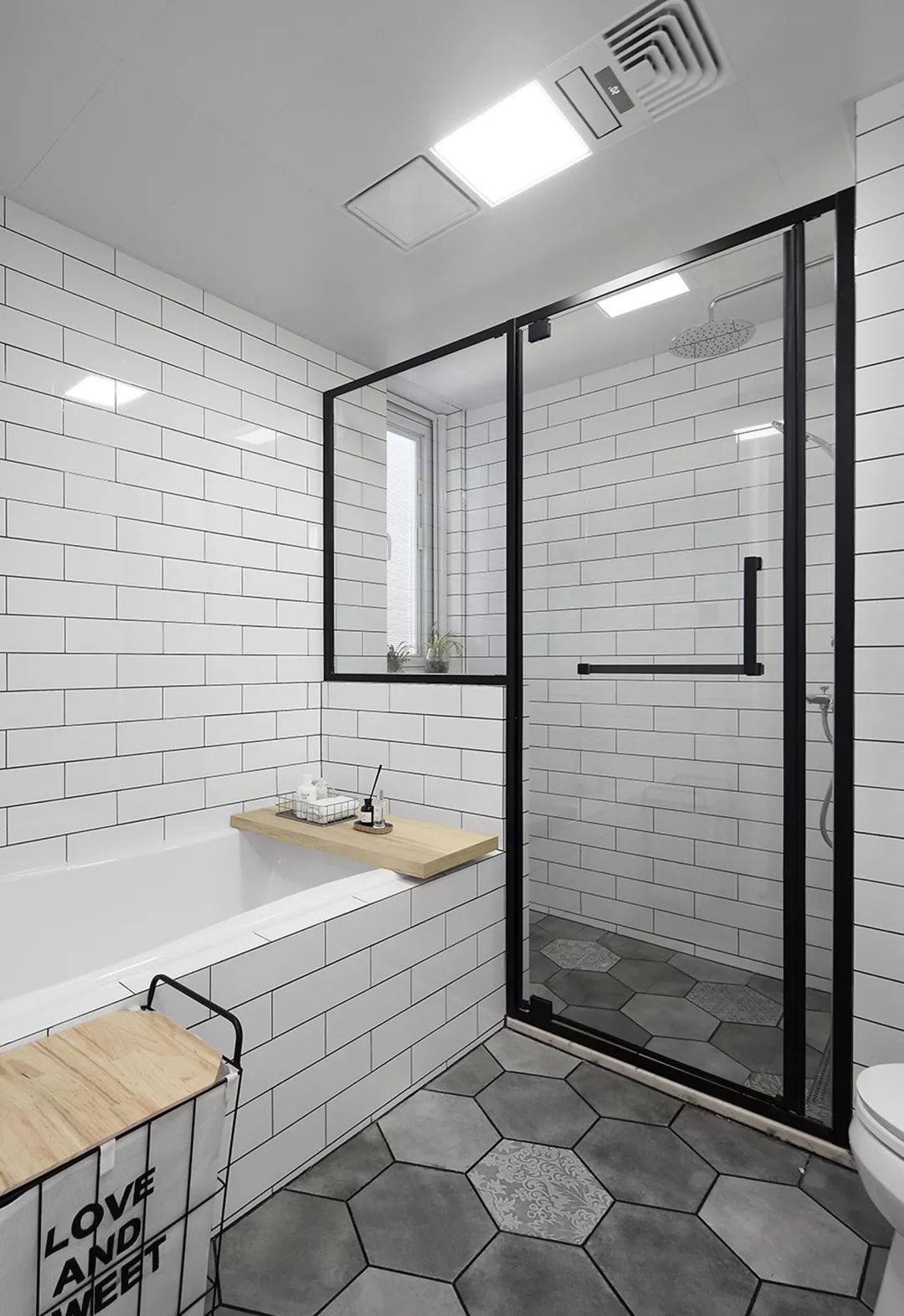 衛生間的洗手臺被放在了門外,衛生間內部是劃分出淋浴區、浴缸區和馬桶區,做舊質感的六邊磚,讓衛生間更有文藝范。