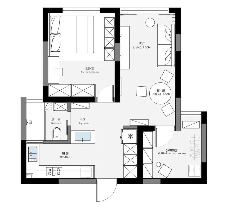 開放式廚房設計,提高了空間的利用率,小白磚與高級灰櫥柜搭配顯得干凈利落。
