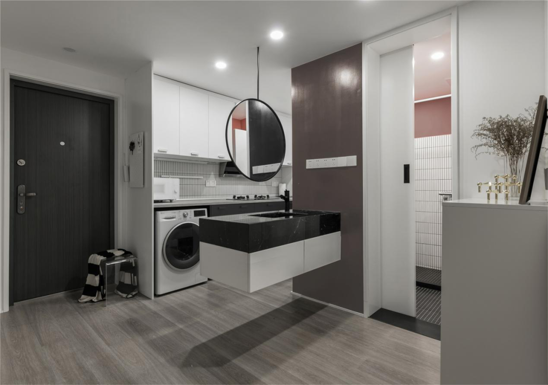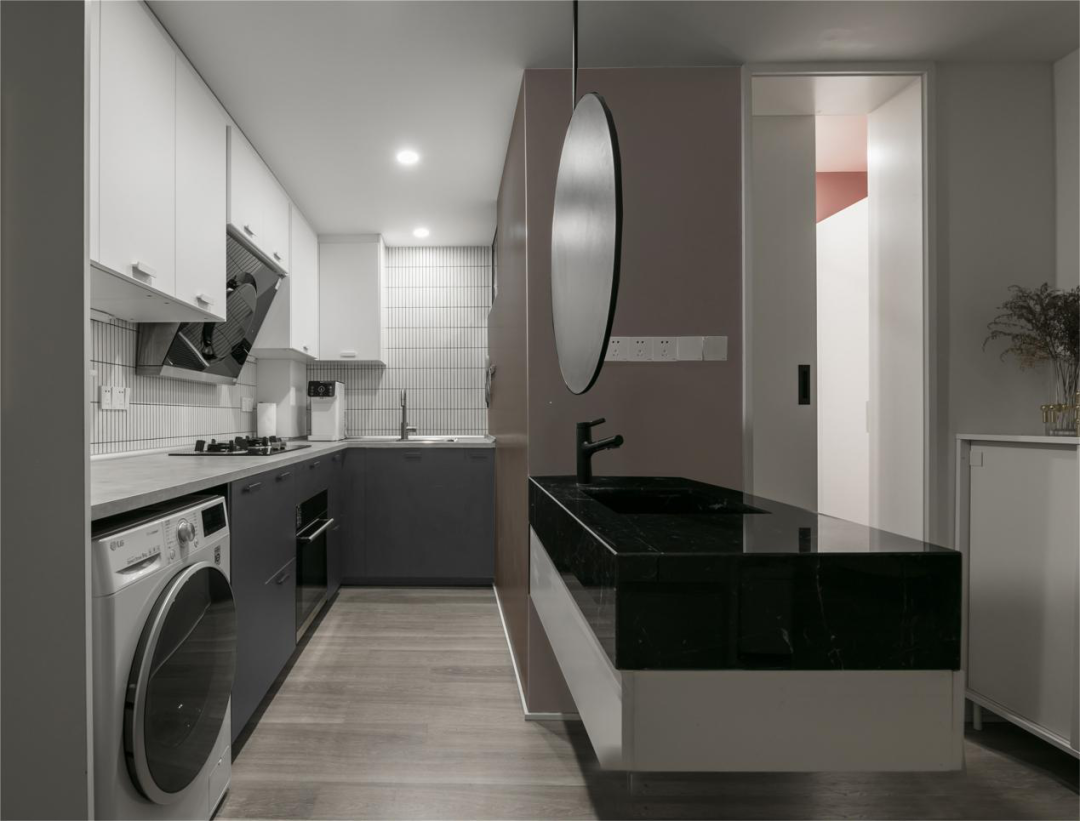 衛生間的洗手臺挪到廚房這一邊,釋放了衛生間內部空間。洗手臺懸空打造,鏡子從天花吊下來,整個造型獨特亮眼增加了視覺上的通透感,又減少了占地位置方便打掃。