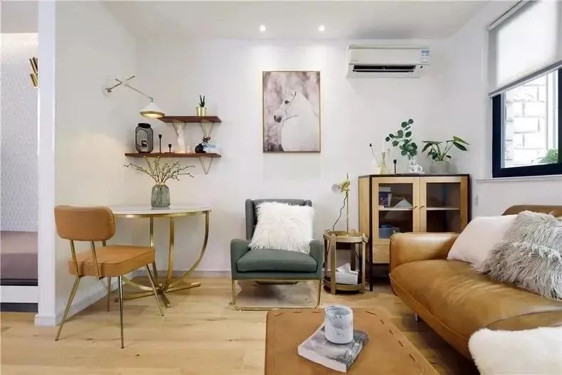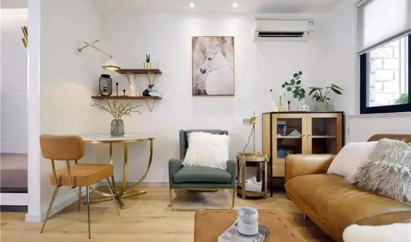客餐廳連在一起,北歐風融合現代風的設計,金棕色軟裝家具配飾使得狹小的空間也能盡顯精致