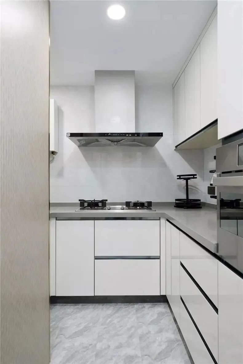 廚房黑白雙色設計,精致典雅,L型櫥柜有足夠的收納,封閉式設計,避免油煙侵擾。
