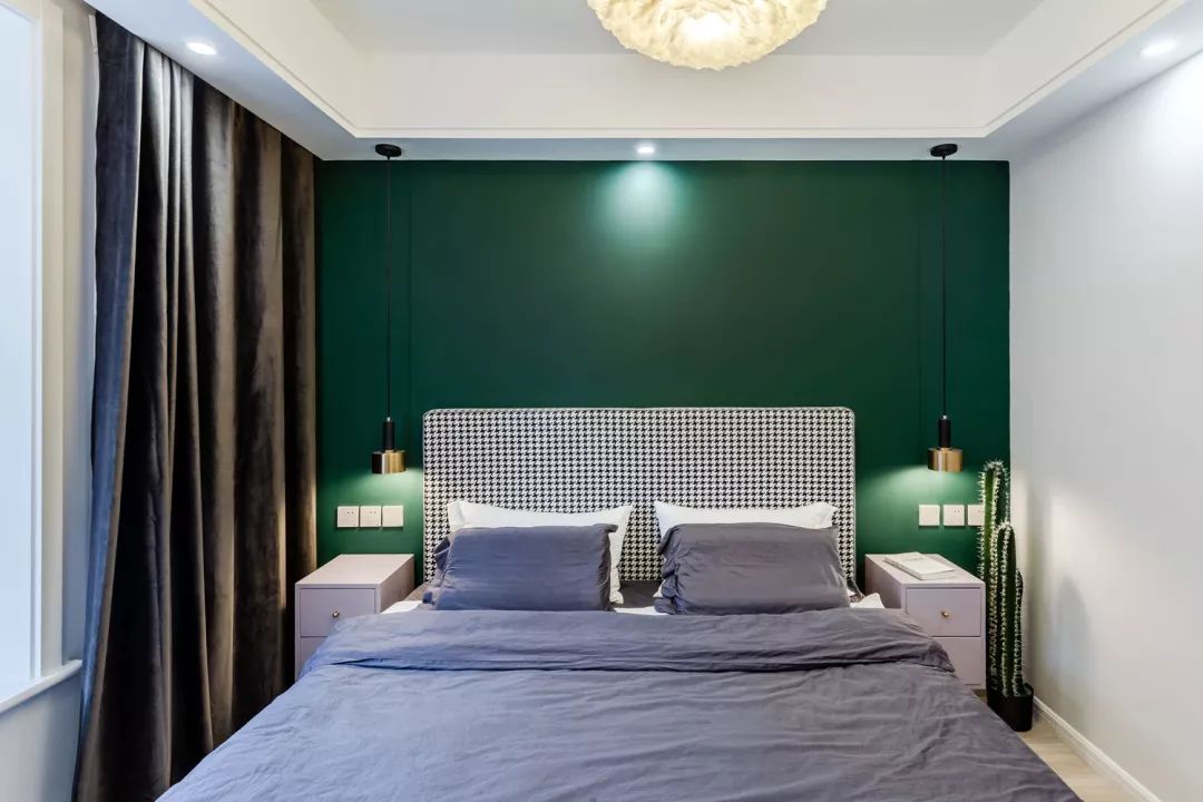 主臥的床頭背景墻被刷成了墨綠色,床頭兩側對稱擺放床頭柜和壁燈,格紋布藝的靠背和灰色的床品結合,帶來輕松感覺。