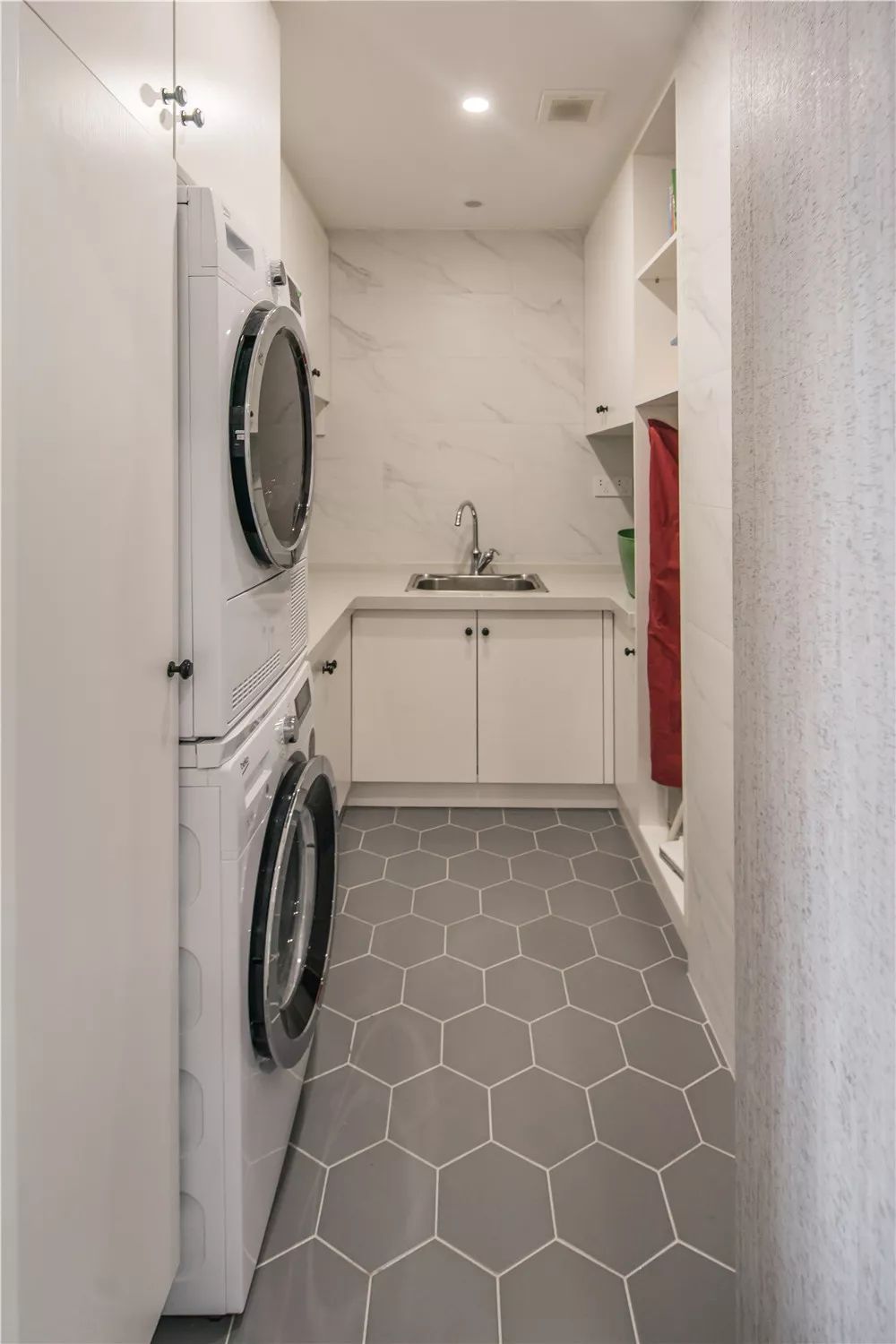 在二樓有著一個獨立的洗衣房空間,屋主把洗衣機、烘干機都放在了這里,然后周邊也做了洗手臺和儲物柜,這樣一個雜物間也很讓人羨慕。