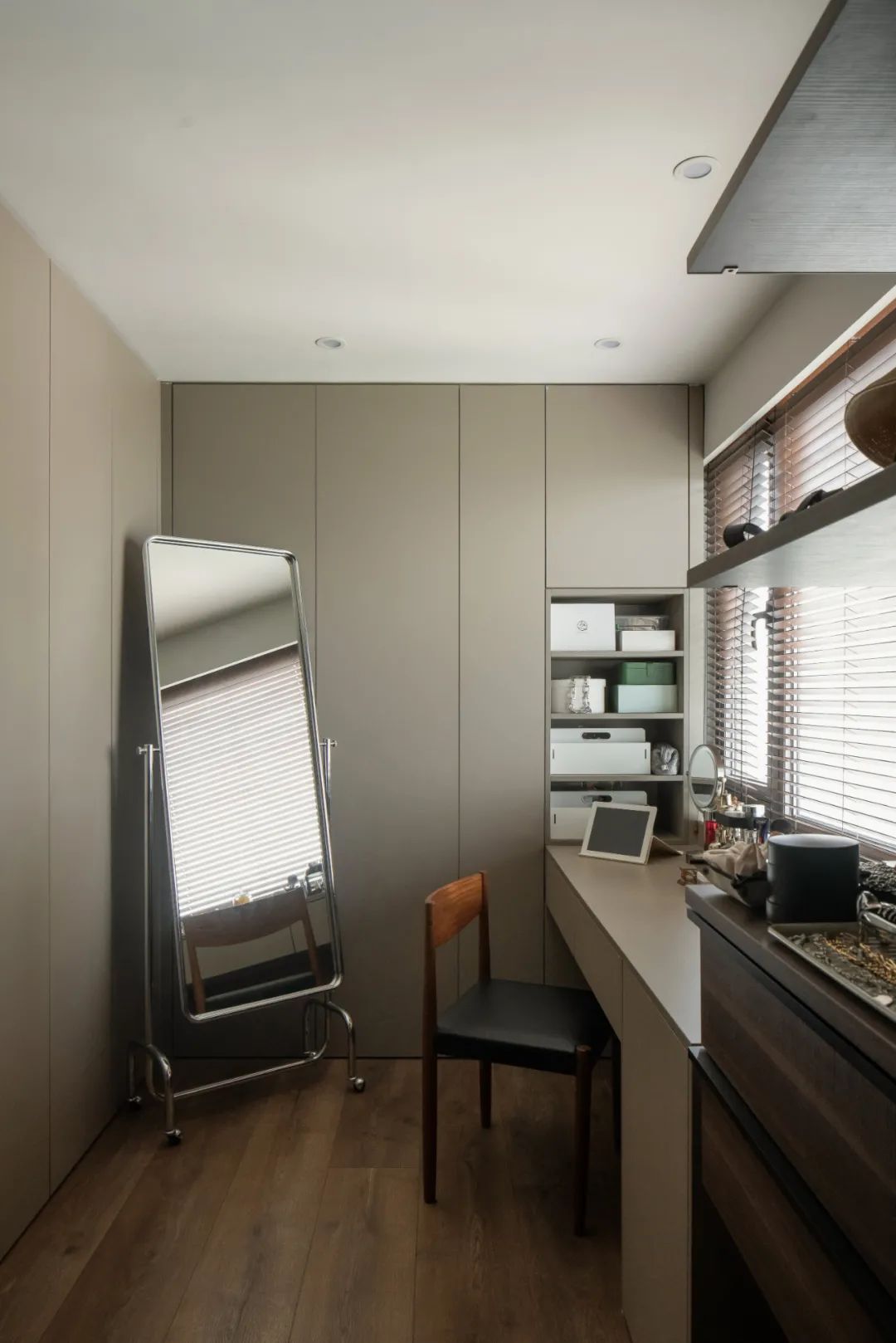 衣帽間做了三個區分,一個是封閉式帶門,一個是開放擱板,還有一面是玻璃帶門。