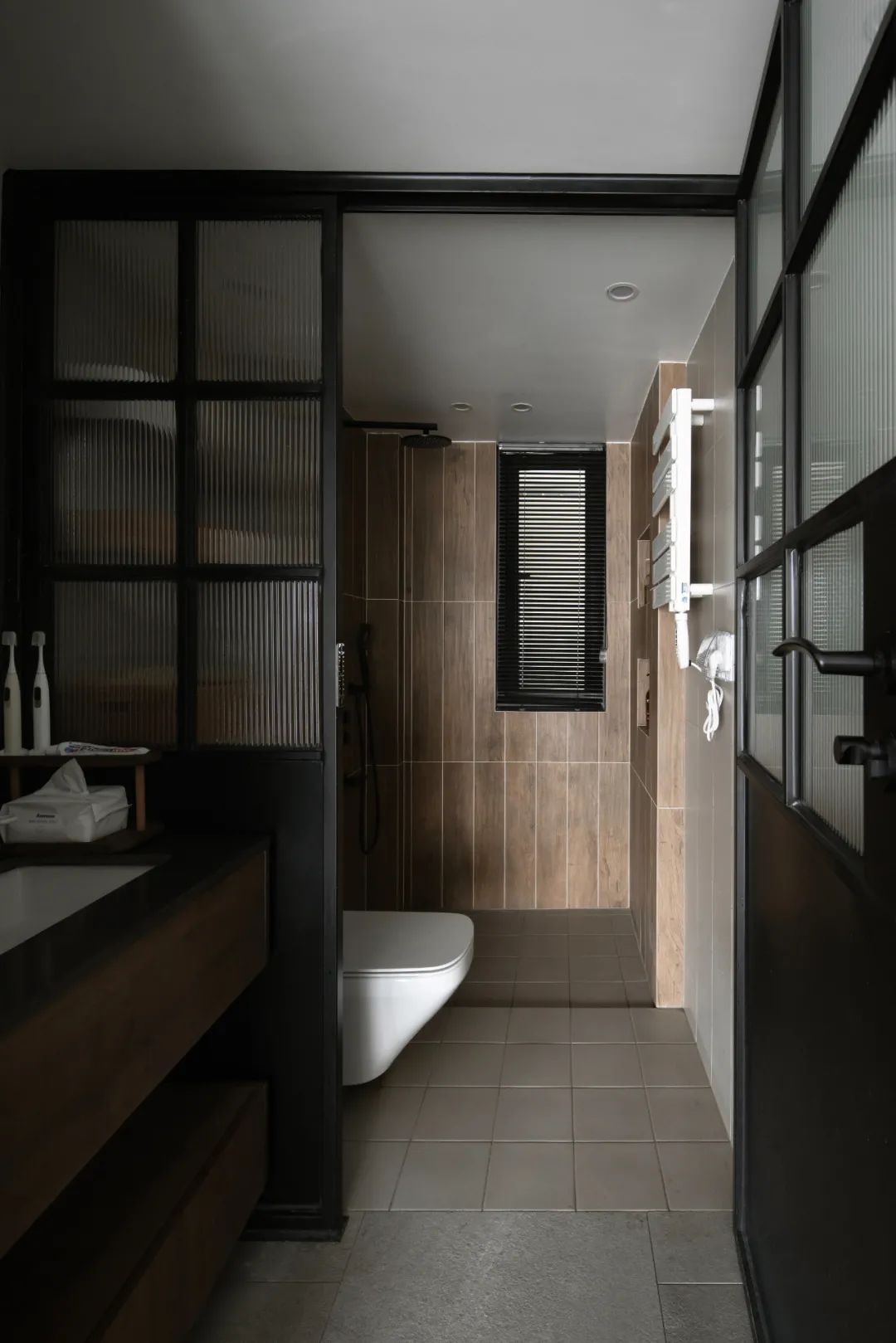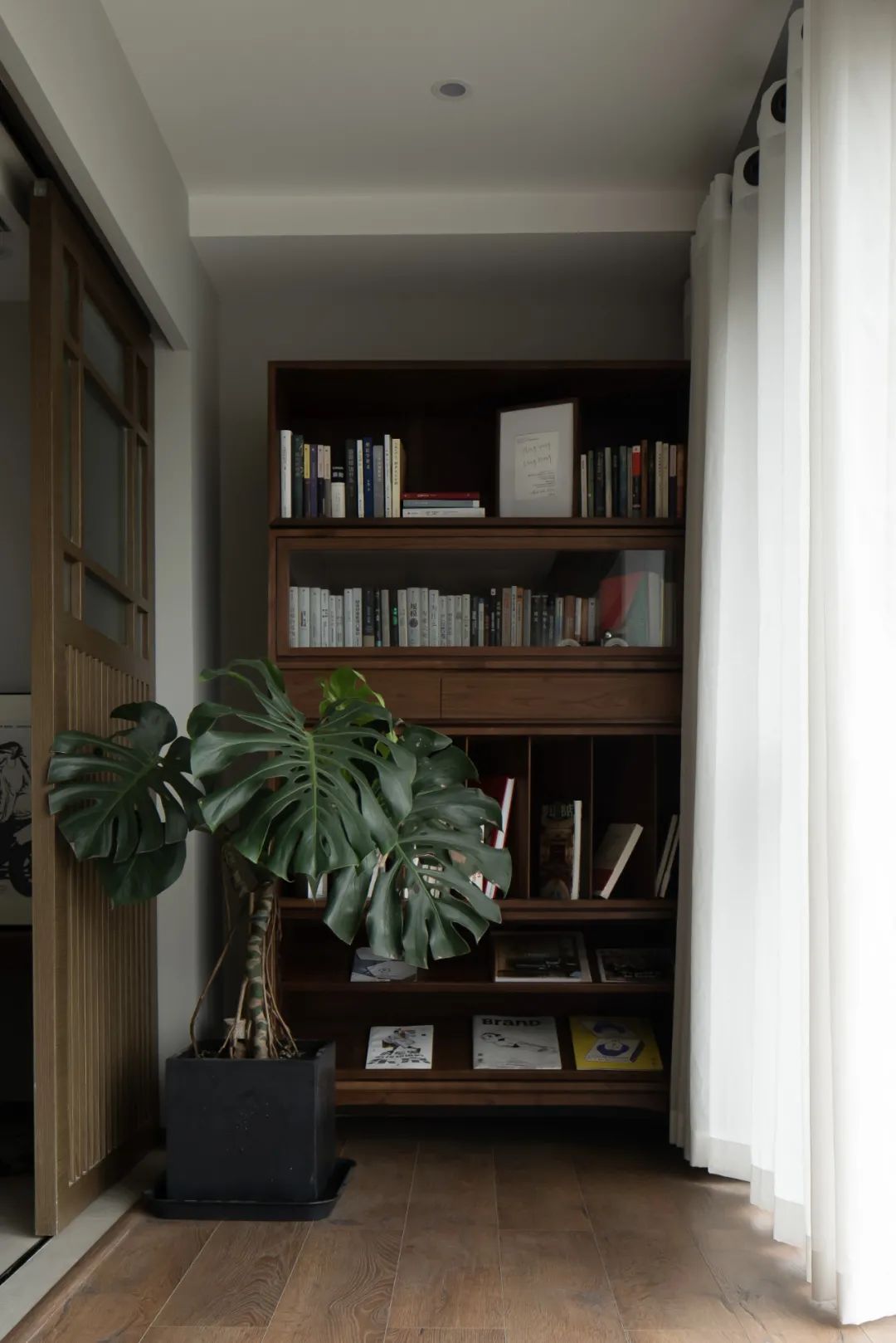 屋主想運動的同時可以觀看電影,同時要有相對的遮擋隱私,我們在陽臺和客廳之間做了可移動的隔斷門扇,空間更加完整又不失靈動。