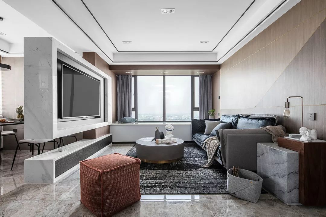 在玄關(guān)門廳的另一側(cè)就是客廳空間,沙發(fā)背景墻上做了拼色的木飾面板設(shè)計(jì),灰色系的窗簾、茶幾、地毯和沙發(fā)結(jié)合起來,顯得更加年輕大方。