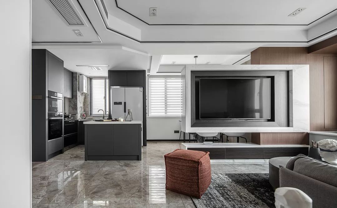 從客廳可以看完餐廳和廚房,廚房?jī)?nèi)部是L型櫥柜搭配島臺(tái)的設(shè)計(jì),深色系的櫥柜和大理石地面結(jié)合起來,顯得精致而又優(yōu)雅。